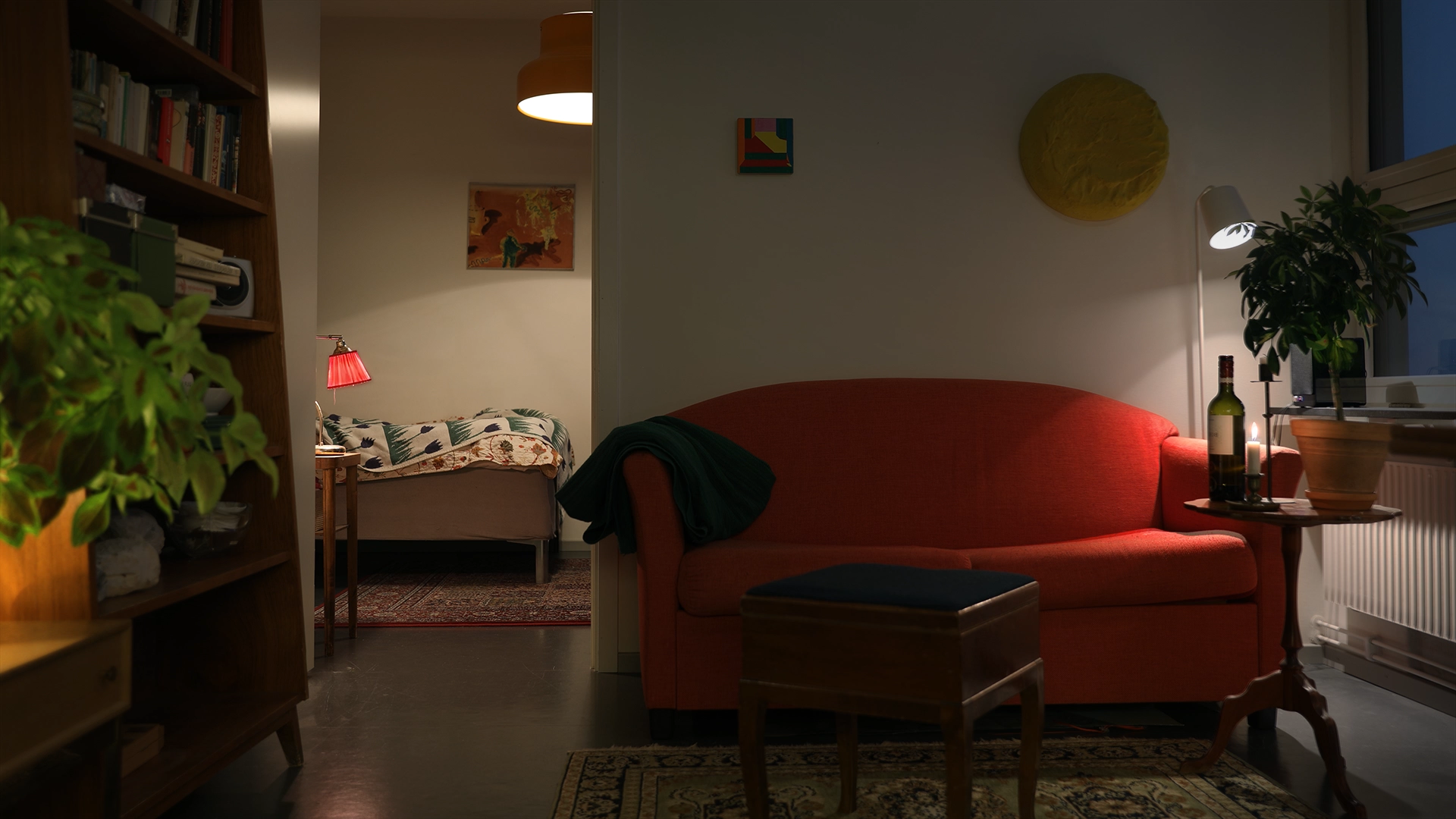 This work was exhibited at Konstfack in 2021, it consists of 3 synchronized videos on tv-screens and stereo sound through speakers. The screens are installed vertically inside a site built cone-shaped box with black walls and carpet. It’s a rhythmic stop motion piece with panorations through layered still-images, creating a distorted and two-dimensional perception of space and time. The screens display apposing images of a home in detail or wide-shot. The space is either furnished and dimly lit, or bright and empty.